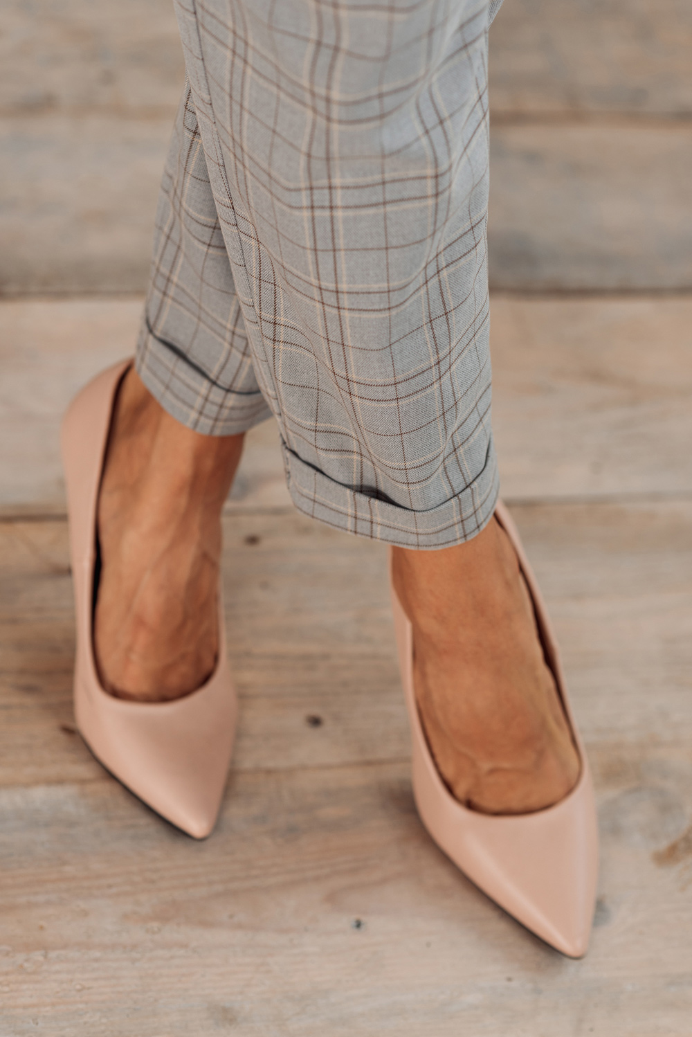 Трендові штани в клітку з високою посадкою. Застібаються на змійку і гудзик, а також на чорний, тонкий пояс з пряжкою. Спереду закладені складки, з боків кишені. Низ на манжеті. Тепла і приємна до тіла тканина. Колекція так само включає піджаки в такому ж стилі і кольорі.