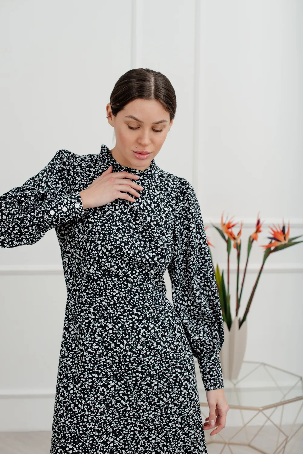 Сукня з коміром-стійкою з ніжними рюшами. Напівприлеглого силуету довжиною міді. Відрізне по талії, довгий рукав зі збірками по лінії оката та по низу, рукав на манжеті з гудзиками. По спинці збірка по талії на еластичну тасьму. По горловині зав'язка – куліска.