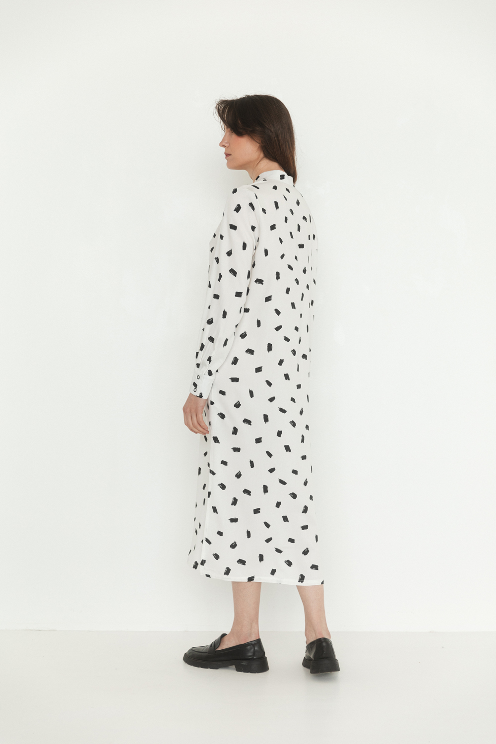 Стильне вільне плаття з добіркою від коміра-стійки та потайною застібкою. Елегантні розрізи з бокових швів і рукав з манжетами і гудзиками додають особливу родзинку. Зручність та модний образ в одному! Відмінний вибір для гардеробу.