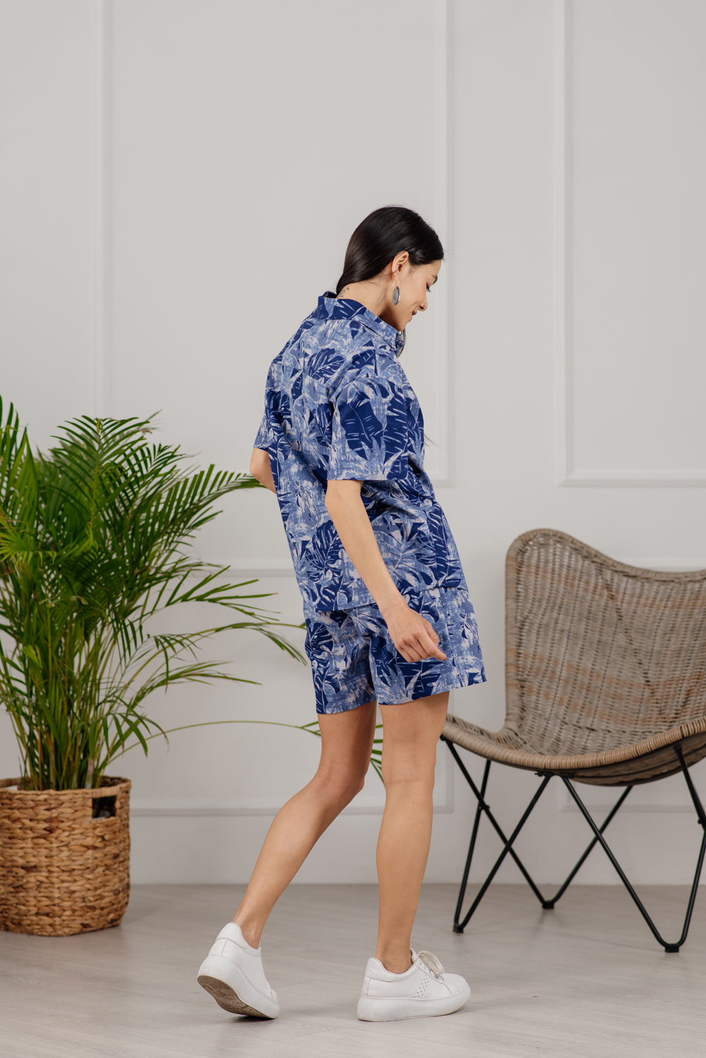A trendy linen suit. Shirt with a turndown collar, buttoned, lowered, short sleeves. Shorts with side pockets, elasticated belt. Soft and pleasant to the body fabric!