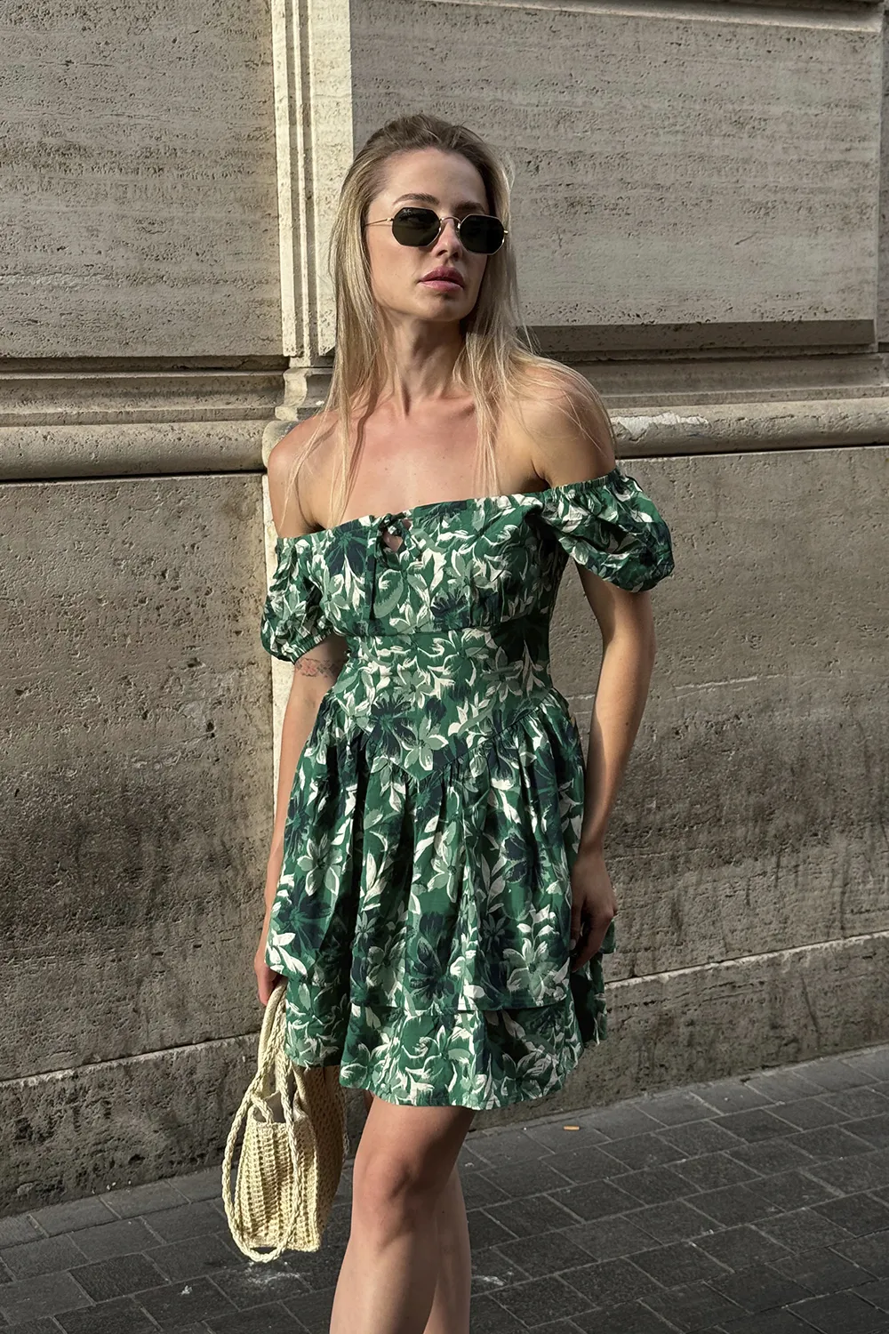 Fitted dress with a full double skirt and puffed sleeves with elastic. The bodice is adjustable with a drawstring for a perfect fit. The fastening on the back is a zipper. Ideal for special occasions and everyday elegance.