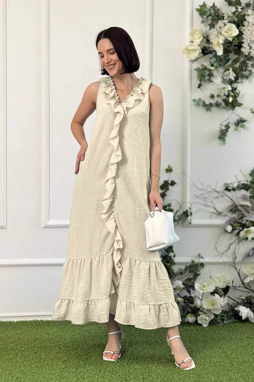 A light, loose dress with a frill at the front and a double frill at the bottom. The feminine style is perfect for walks, dates and summer parties.