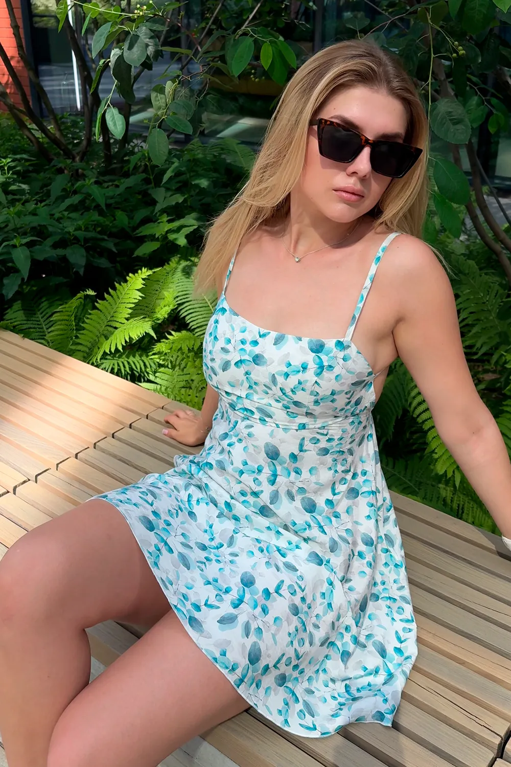 Summer dress with open back and ties at the back is a stylish choice for hot days. Loose flared skirt above the knee and elastic waist provide comfort and light feminine silhouette. Ideal for walks, dates and rest.