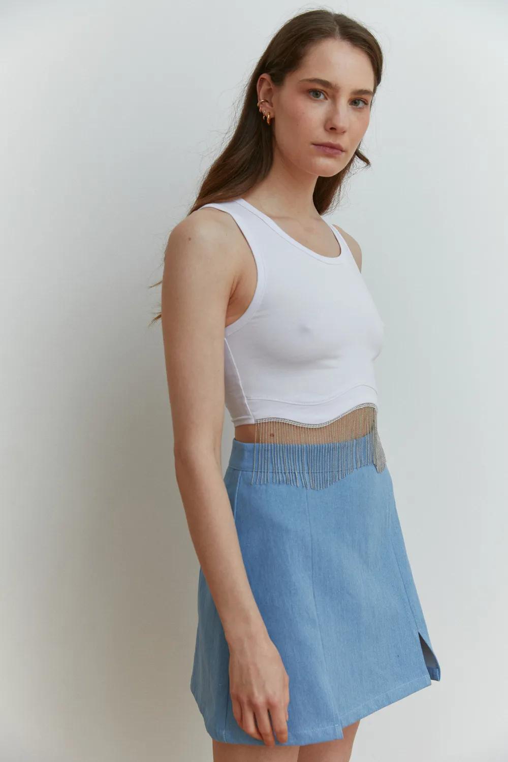 White Sleeveless Top with Silver Beaded Fringe