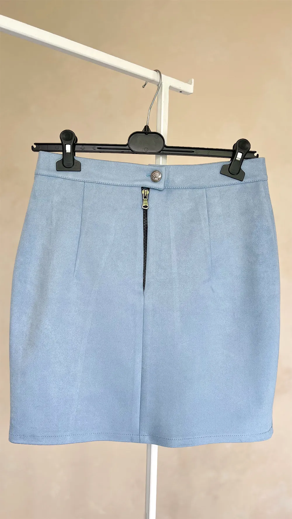 Suede mini skirt with eyelets. A-line shape of the skirt visually narrows the waist and slims the legs.