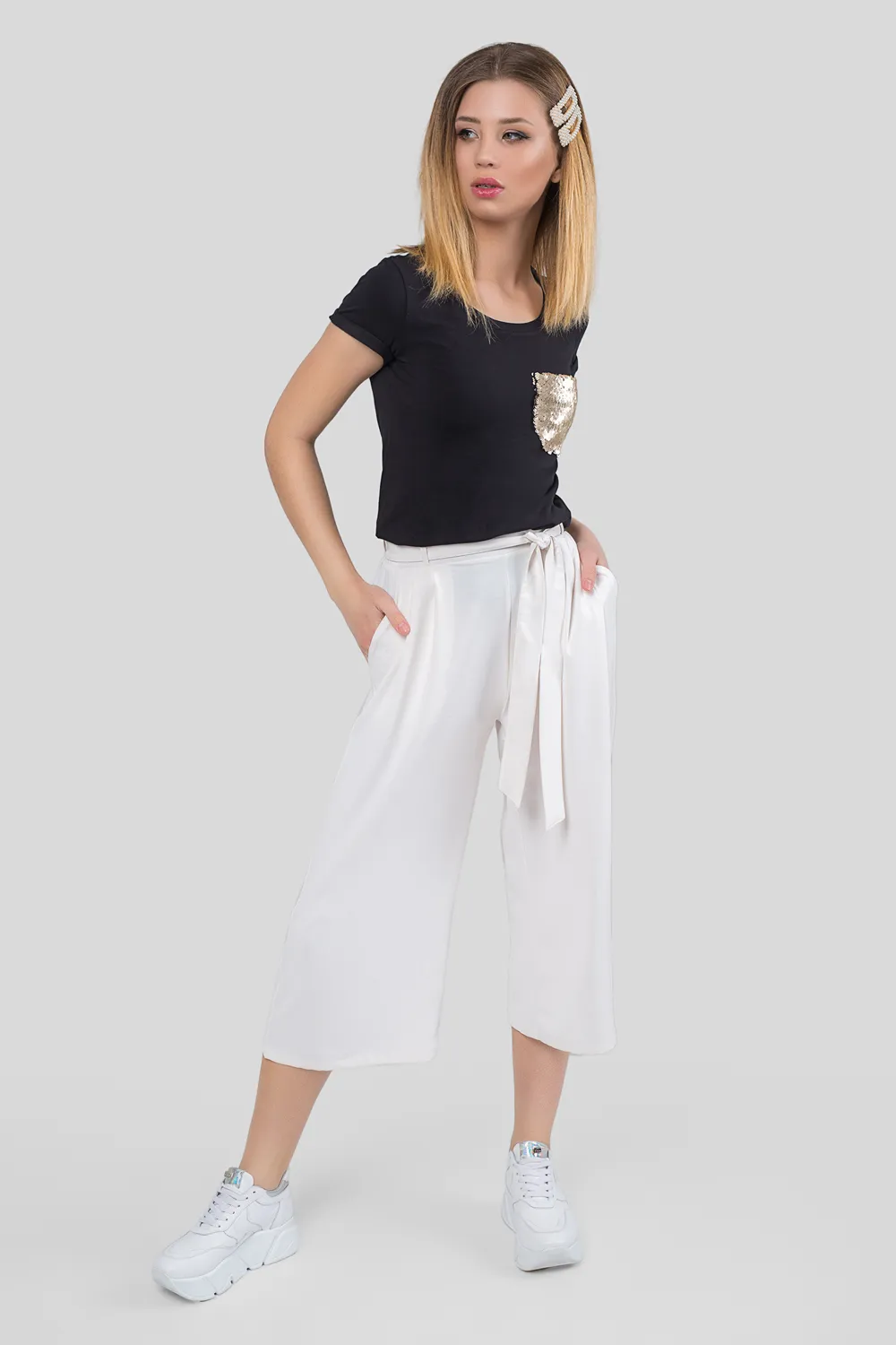 Трендовые брюки фасона кюлоты. Талия на резинке, шлевки, завязывается на пояс. Расклешённый фасон, по бокам карманы и складки. Струящаяся, легкая ткань. Кюлоты будут идеально смотреться с любой обувью. Отлично садятся на любую фигуру. Незаменимый элемент гардероба на весну и лето.