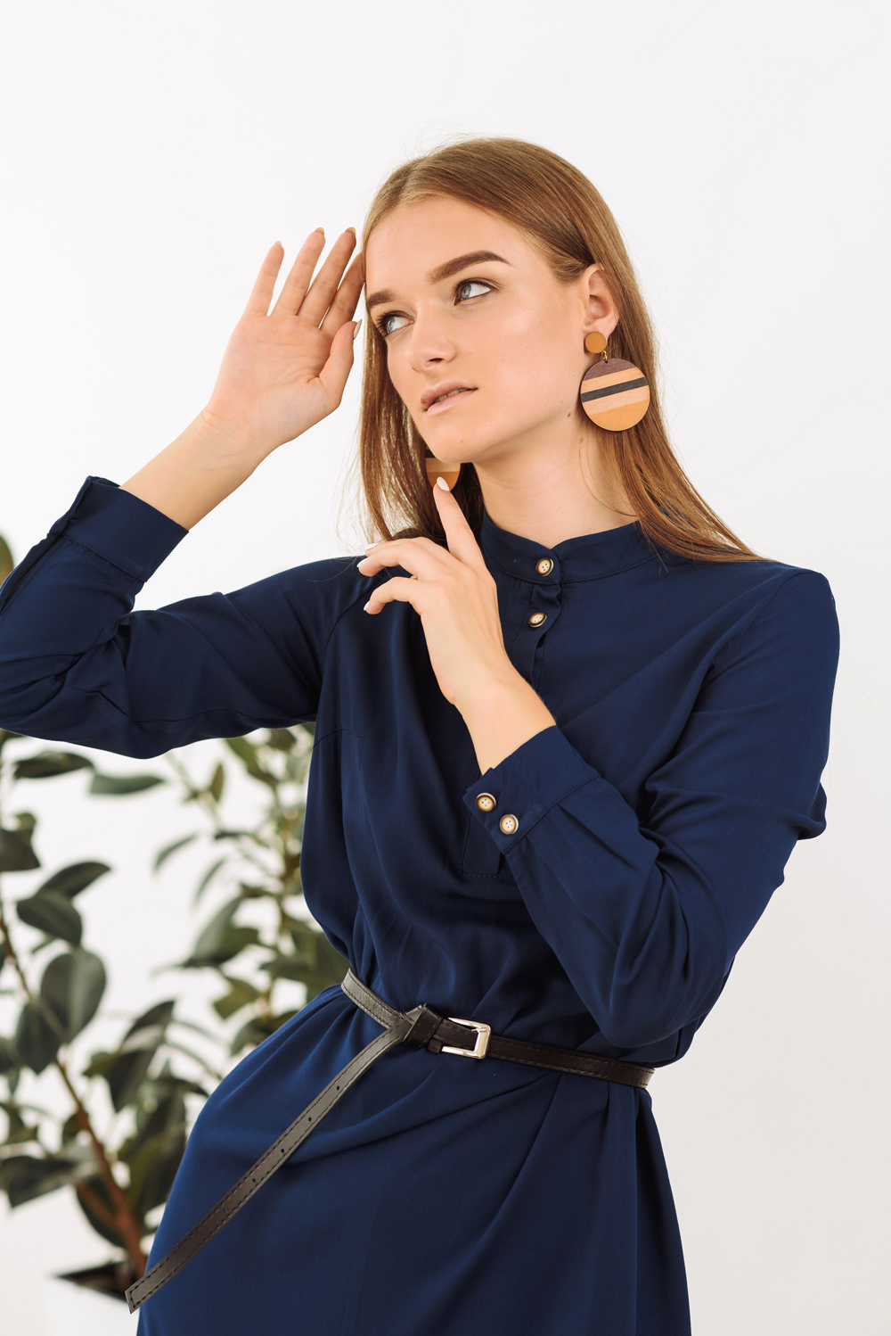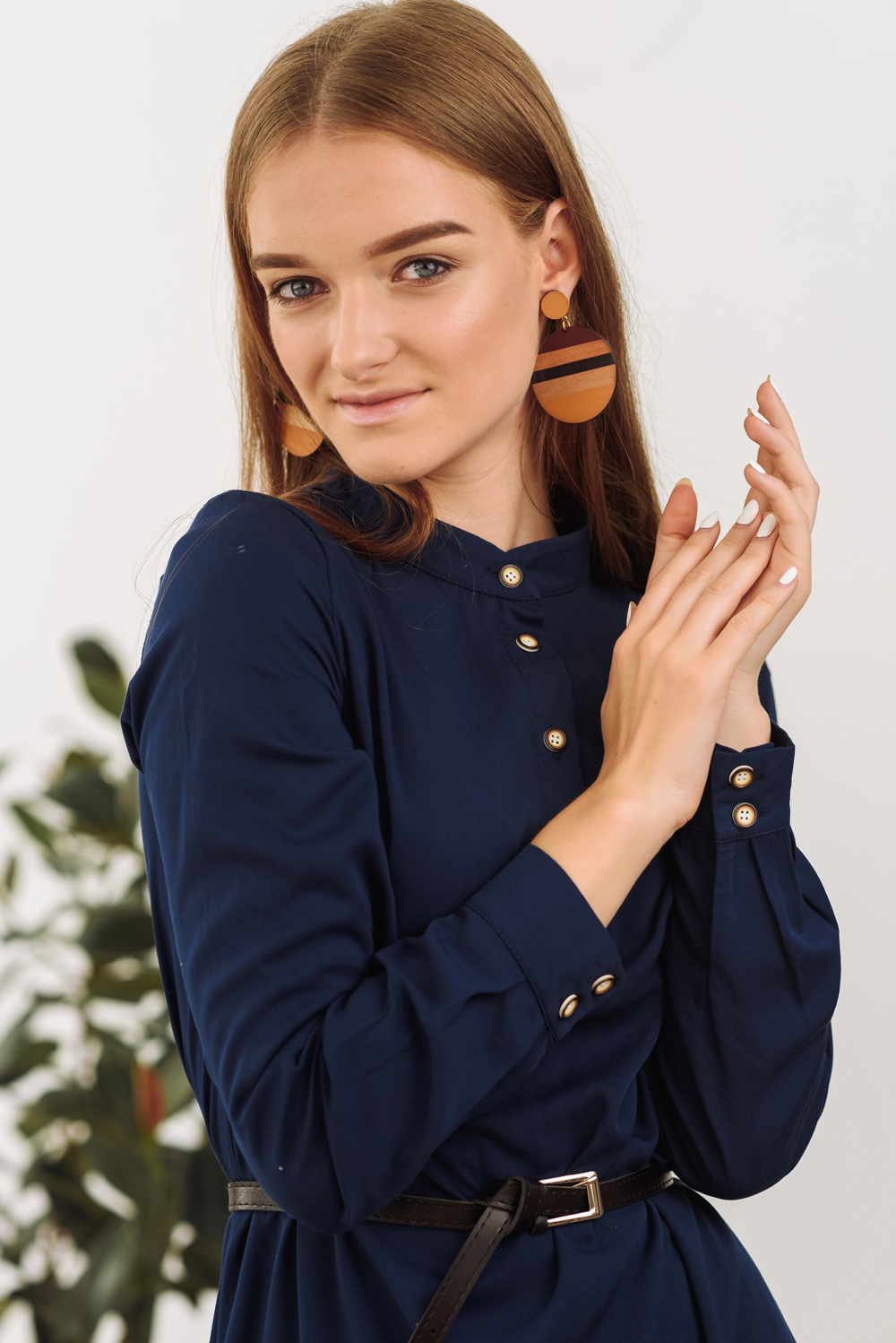 Длинное платье из коттоновой ткани. Спереди застегивается на пуговицы, на талии резинка. Длинный рукав с манжетами и пуговицами. Снизу по платью волан со сборкой. На поясе завязывается на съемный пояс в тон платью с наконечниками.