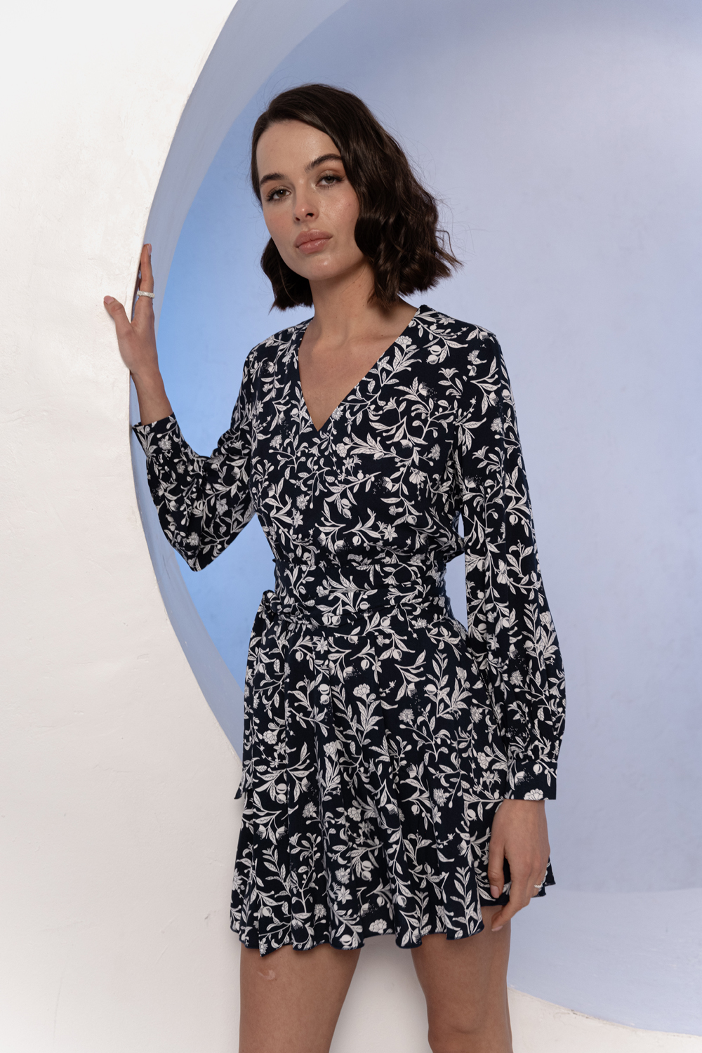 Свободное платье-мини с резинкой на талии для идеальной посадки. Платье дополнено длинными свободными рукавами на манжете и очаровательным широким поясом - кушаком, создающим непринужденный и стильный образ для любого случая.