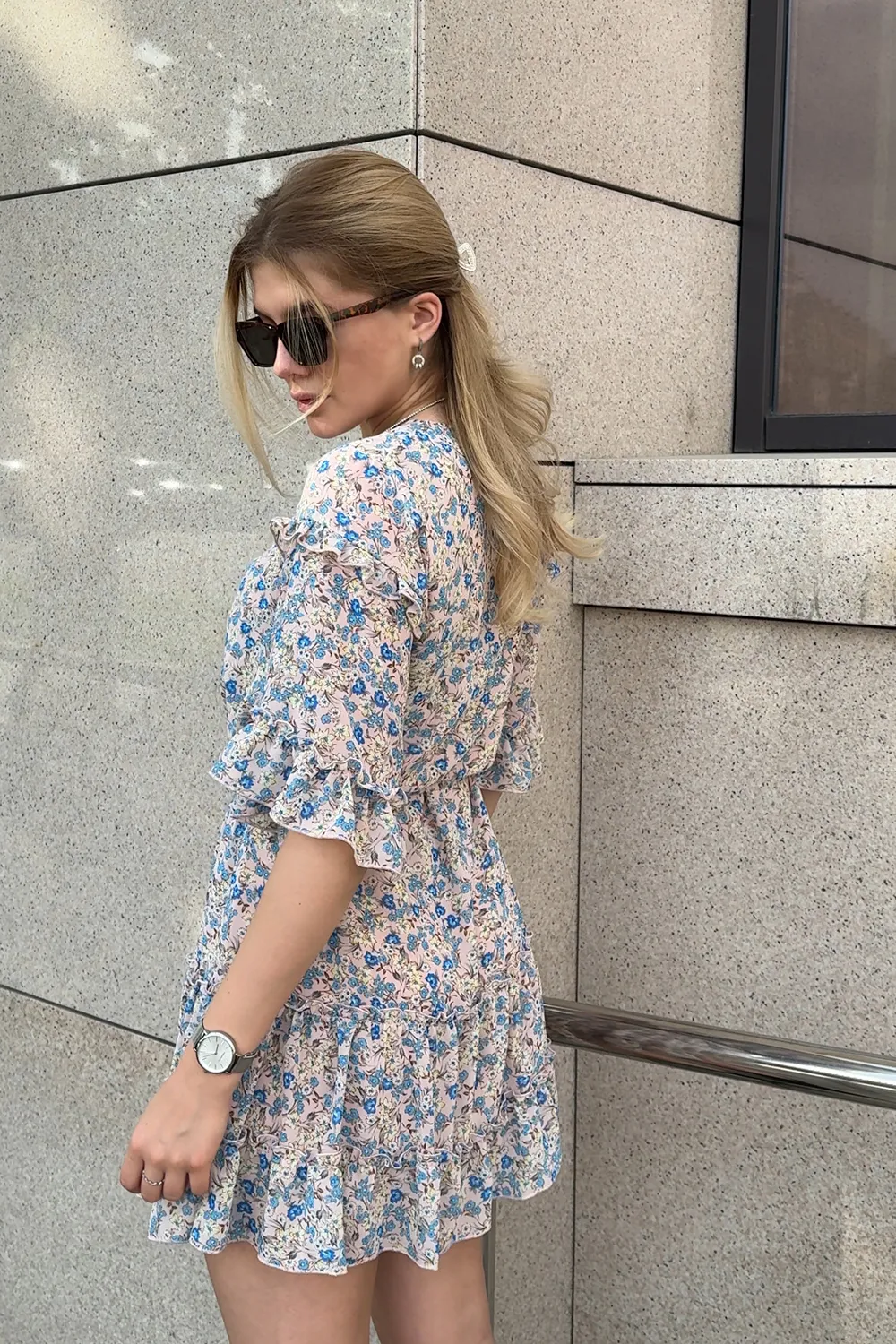 Свободное шифоновое платье на подкладке с тонким поясом. Рукав до локтя, по низу платья и рукавам — нежные рюши. Лёгкий, женственный силуэт для летних прогулок, свиданий и мероприятий.