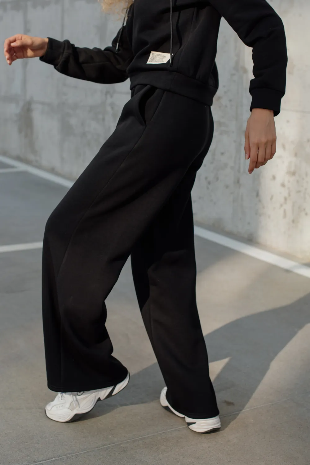 Широкие трикотажные прогулочные брюки из трехнитки на флисе со стрелками. Посадка средняя,на талии. Карманы в боковом шве. Широкий пояс на резинке.