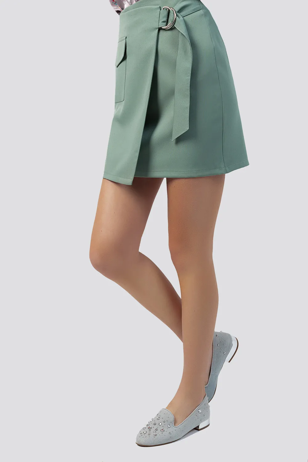 Стильная мини юбка с имитацией запаха, сзади застегивается на потайную змейку, спереди большой функциональный карман, длину и фасон можно регулировать завязками на полукольцах спереди.
